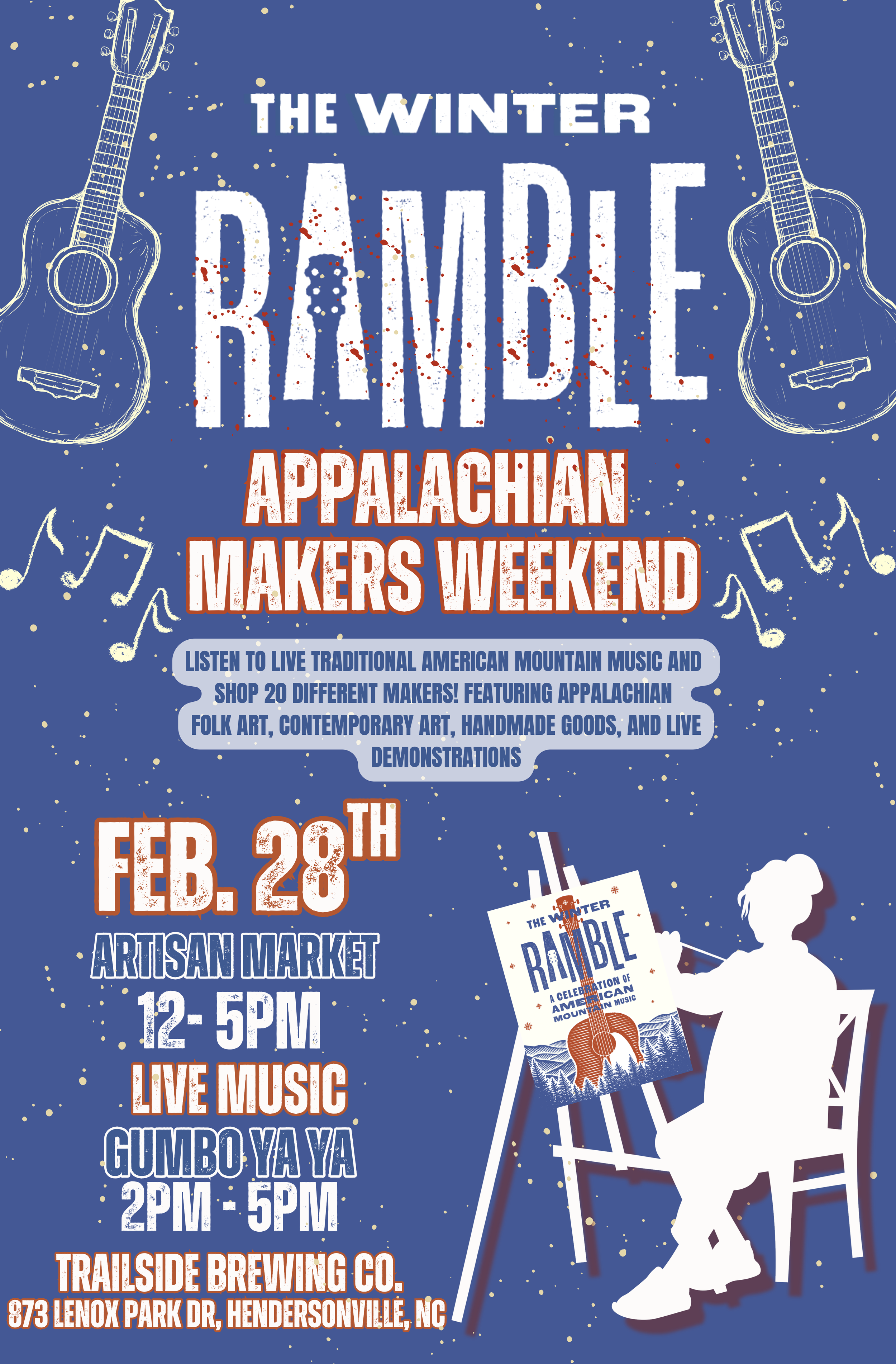 On Saturday, February 28, I’ll be part of the Appalachian Makers Market during the “Winter Ramble Weekend.” This is a “A Celebration of Traditional American Mountain Music and Culture,” and I’ll be at Trailside Brewing from 12-5pm in Hendersonville, NC. Thanks to the Blue Ridge Artisan Market for organizing this art event!