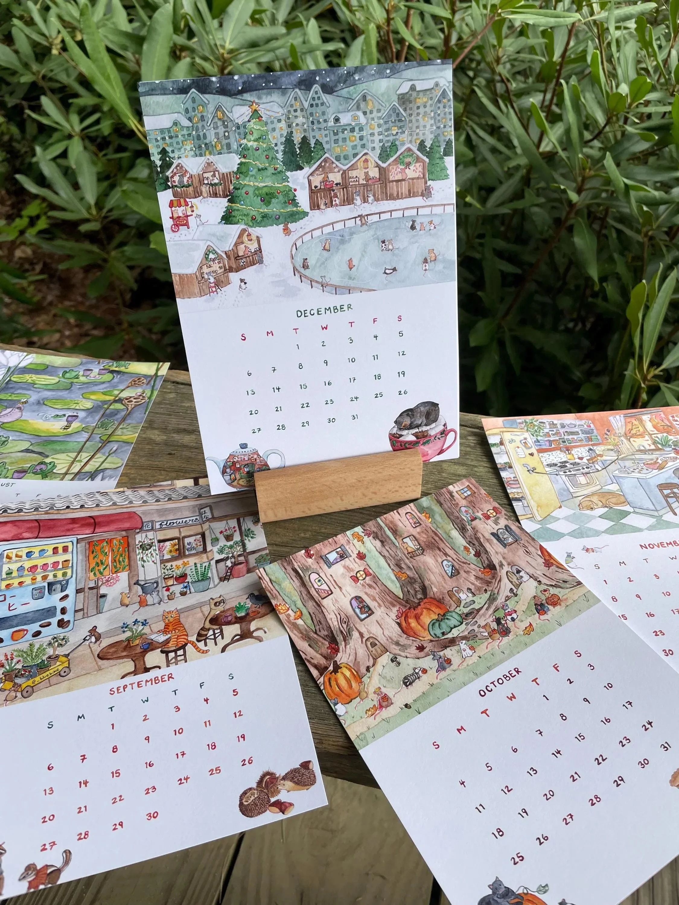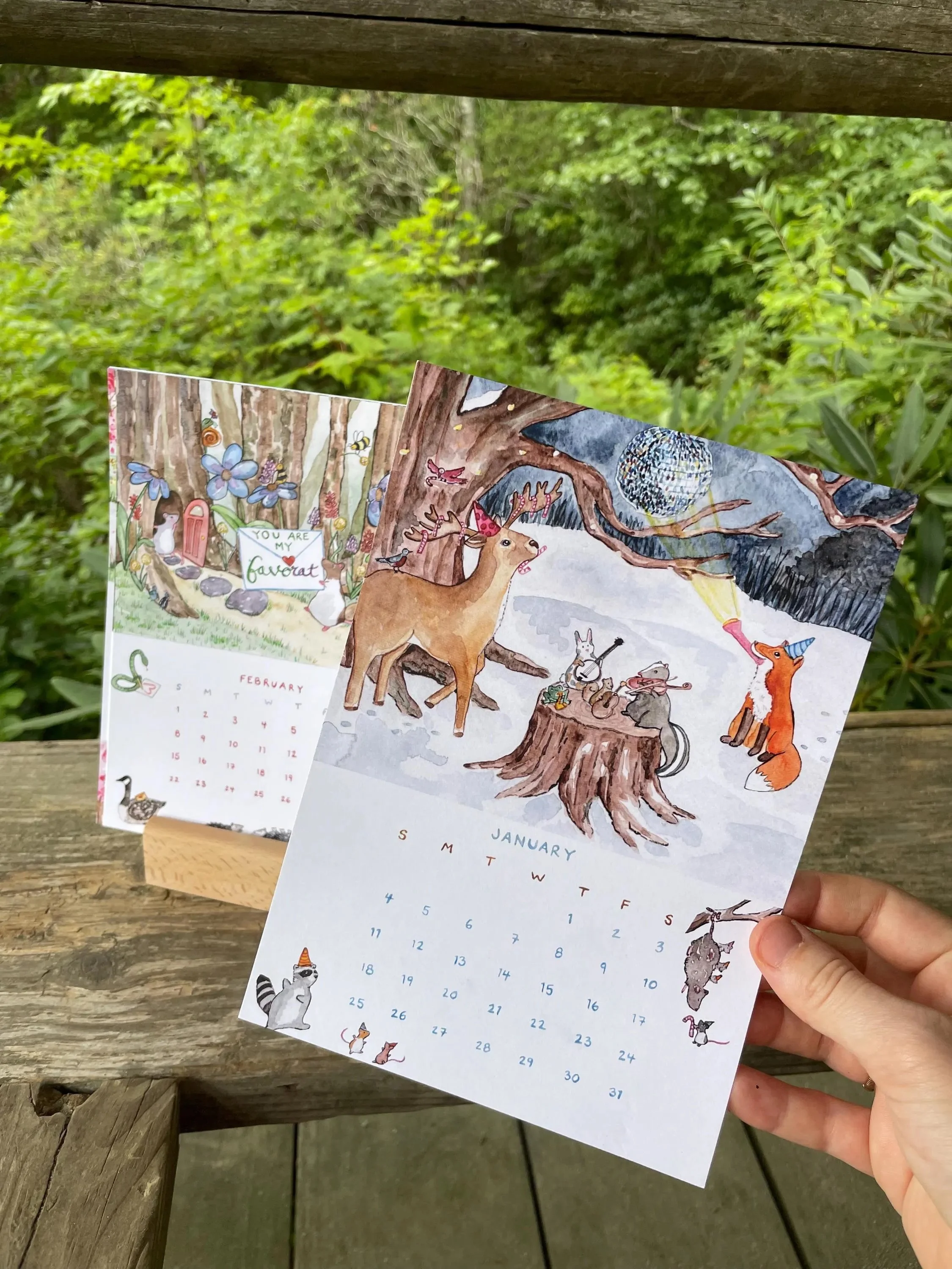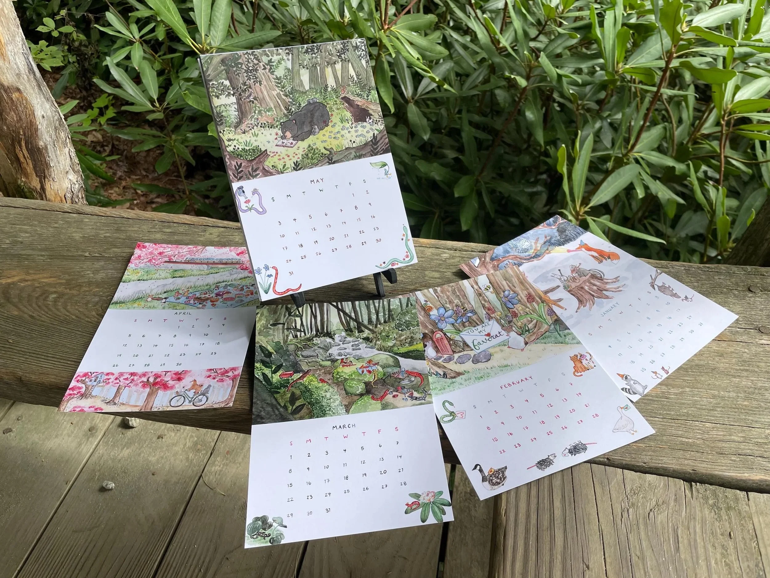 I combined my original illustrations into a 12 page calendar, featuring whimsical animals and nature scenes. The months and dates were hand painted in watercolor, described below.