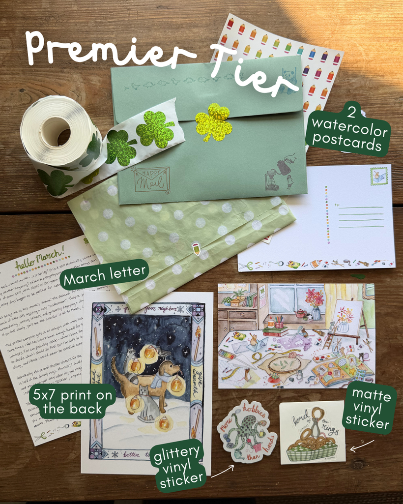 One sticker was an octopus with more hobbies than hands! The vinyl sticker version had glitter accents on the octopus spots, so it shimmered in the light. The other sticker was a rat who was “lord of the onion rings.” The back of this month's letter had a small 5x7" version of my “protect your neighbors” painting.