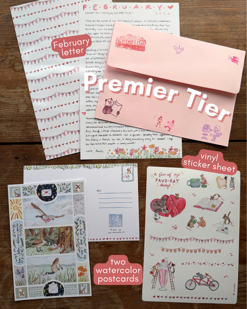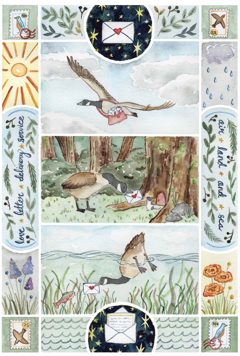 This month the postcard is of the "Love Letter Delivery Service," which makes sure everyone gets their valentines rain or shine! I painted a goose delivering the love letters by air, land, and water. I wanted to choose the goose as the love letter deliverer because they're monogamous birds, often forming lifelong pair bonds to raise their young.