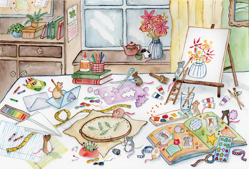 The postcard for this month featured a bunch of little rats enjoying a cozy “crafternoon”. They’re journaling, painting, embroidering, writing letters, and generally enjoying a day of favorite crafts.
