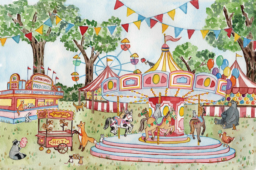 The horses on the merry-go-round also fit the "merry-go-round of life" metaphor - it seemed fitting for the new year, with it's cyclical nature of continuous ups and downs. Our new baby might have also subconsciously influenced the color palette for this month’s card, since it uses a lot of childlike primary colors!